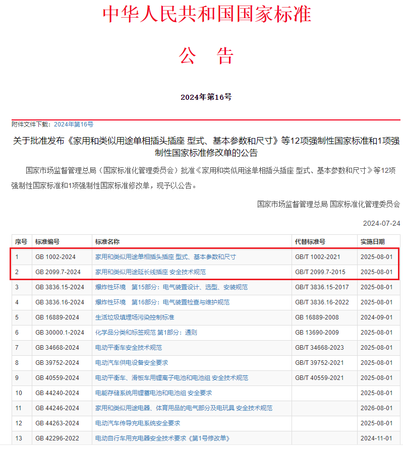 近日,国家标准GB 1002-2024《家用和类似用途单相插头插座 型式、基本参数和尺寸》、GB 2099.7-2024《家用和类似用途延长线插座 安全技术规范》正式发布,推荐性国家标准转为强制性国家标准,插头插座安全强制升级,将于2025年8月1日实施!