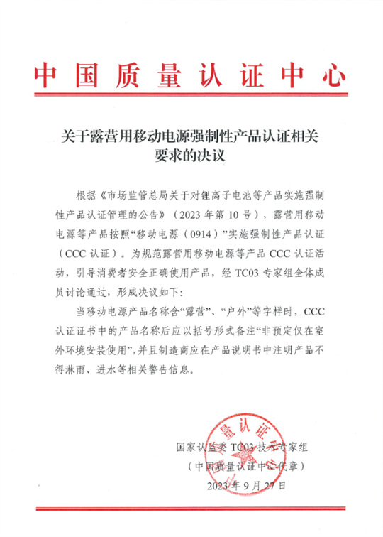 近日,国家认监委官网发布关于露营用移动电源强制性产品认证相关要求、锂离子电池强制性产品认证单元划分和测量允差的两项决议。