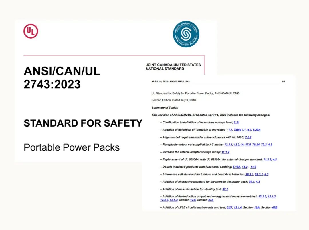 2023年4月14日,美国国家标准协会(ANSI)和加拿大标准委员会(SCC)发布了移动储能电源的安全标准 ANSI/CAN/UL 2743:2023。此新版是旧版UL 2743:2018及UL 2743:2020的一个重要修订,包含了一系列标准优化。