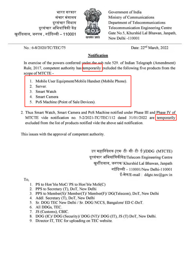 2022年3月22日,印度TEC发布通知,暂将如下五种产品排除在其认证范围之外:1、移动用户设备/移动电话(手机);2、服务器;3、智能手表;4、智能相机;5、POS机
